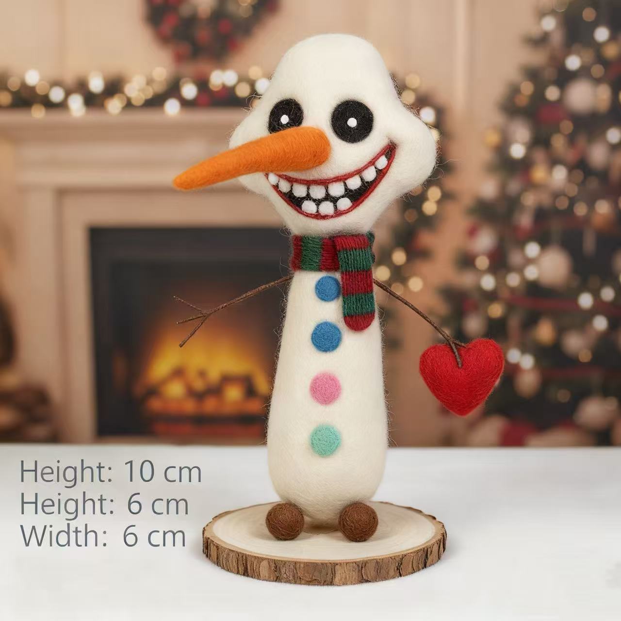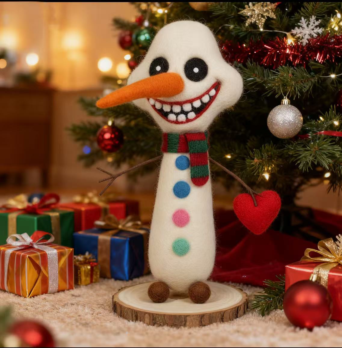 Who could resist this adorable snowman grinning from ear to ear? At a tiny 10cm tall, it comes with a festive red-green scarf and colorful buttons, plus a playful little red heart in its hand——perfect for adding a eye-catching touch to your desk or Christmas tree!