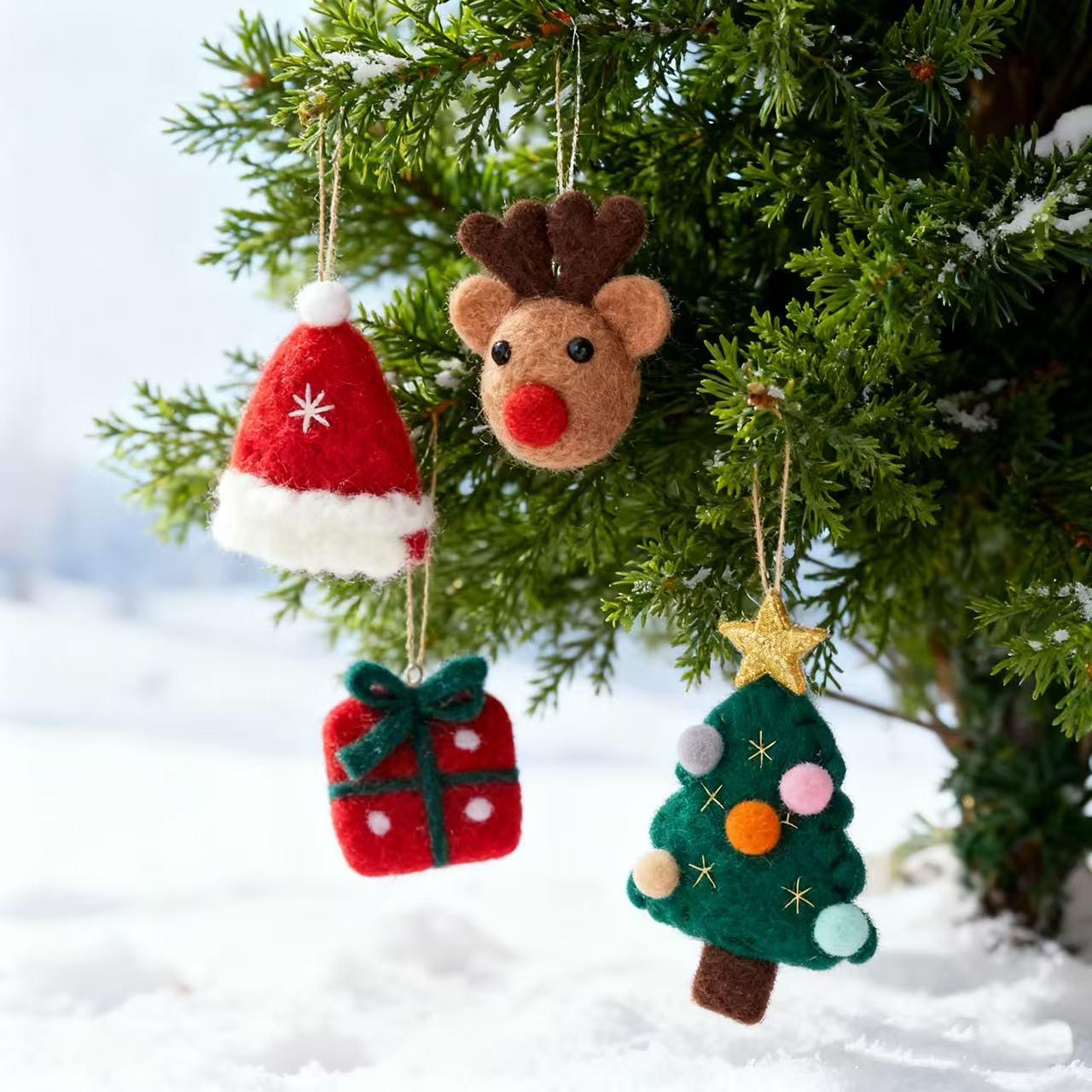 Handmade Holiday Ornament Gift Set — Wool Felt Santa, Reindeer, Tree & Present