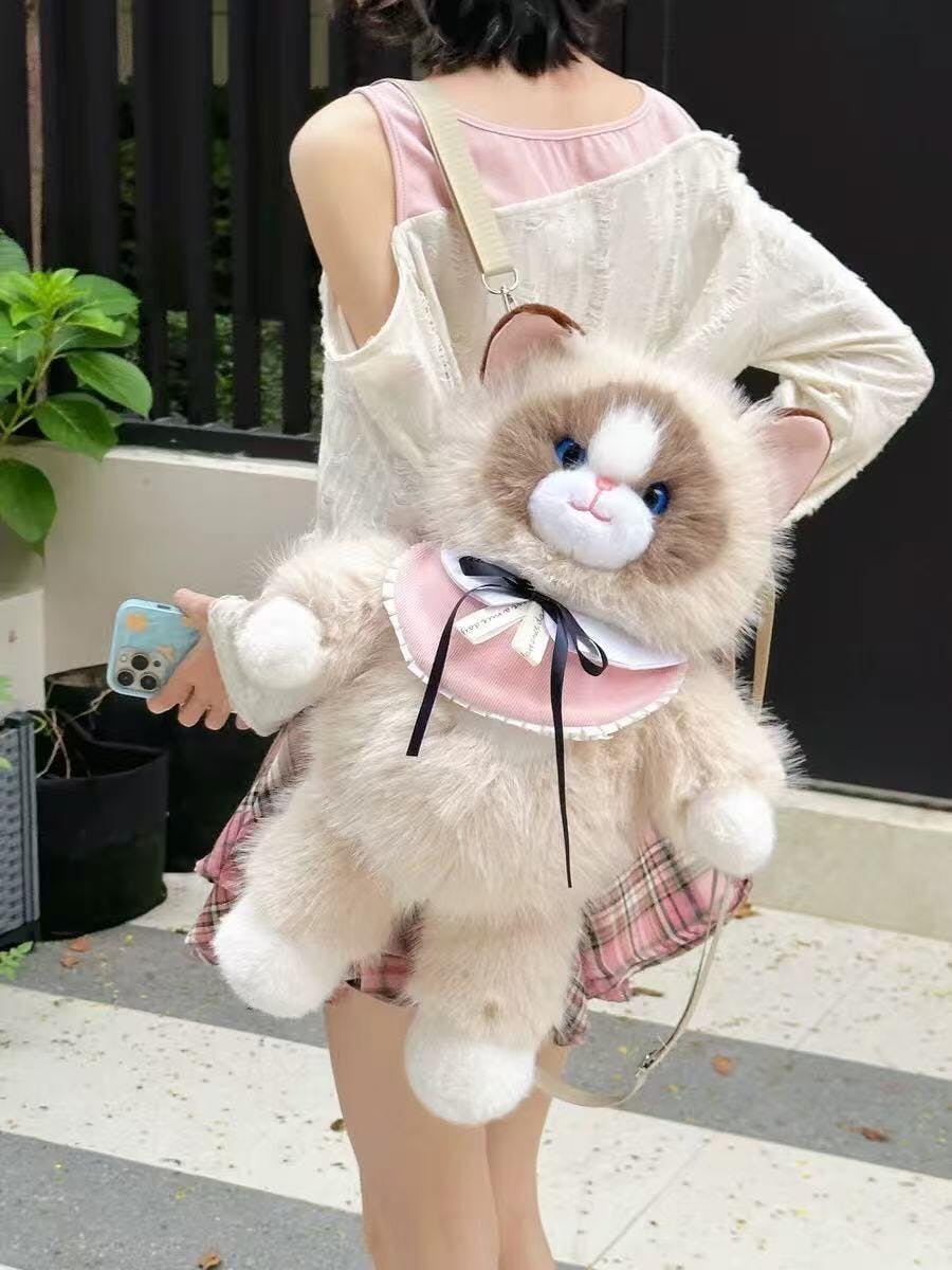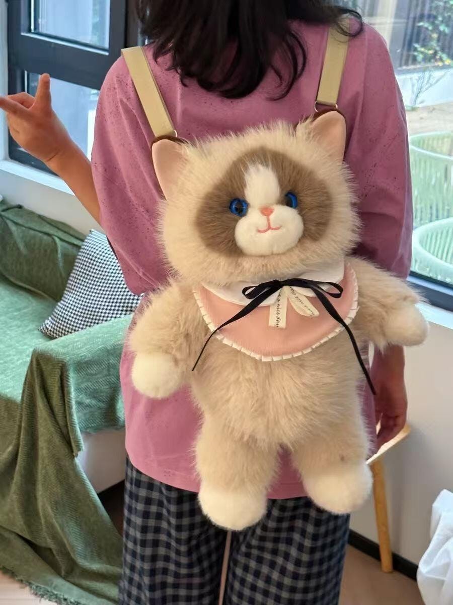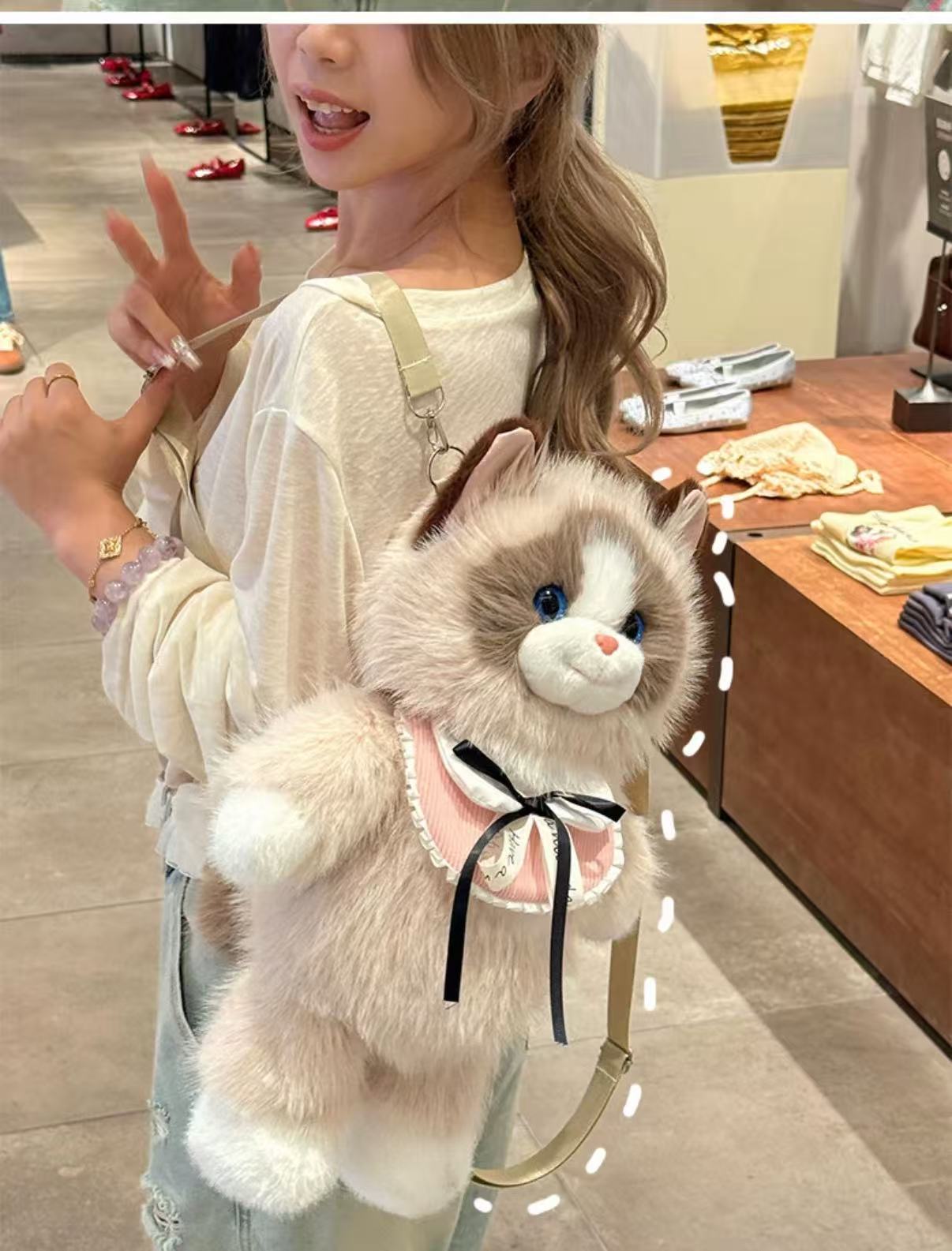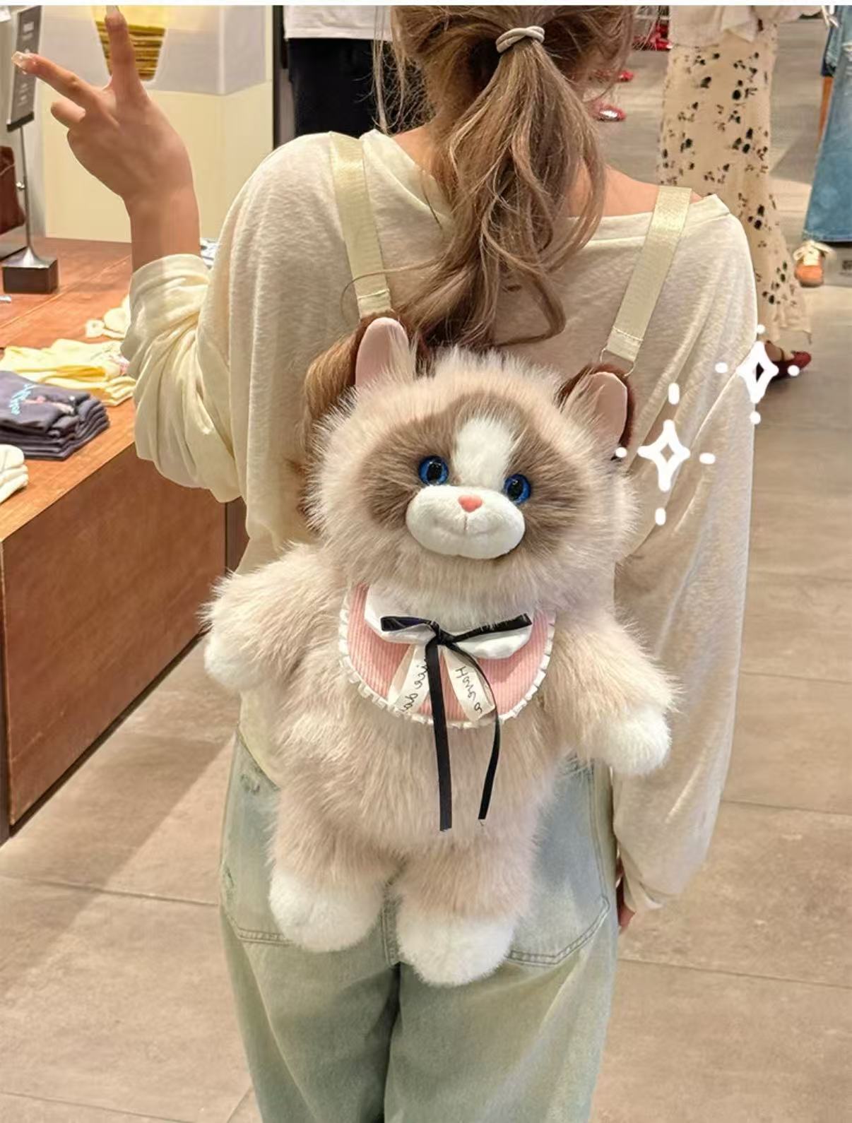 A super-soft, hyper-cute backpack that looks like a real ragdoll cat—complete with 3D ears, bright eyes, and a ribbon bib. Designed for everyday carry and irresistible hugs.