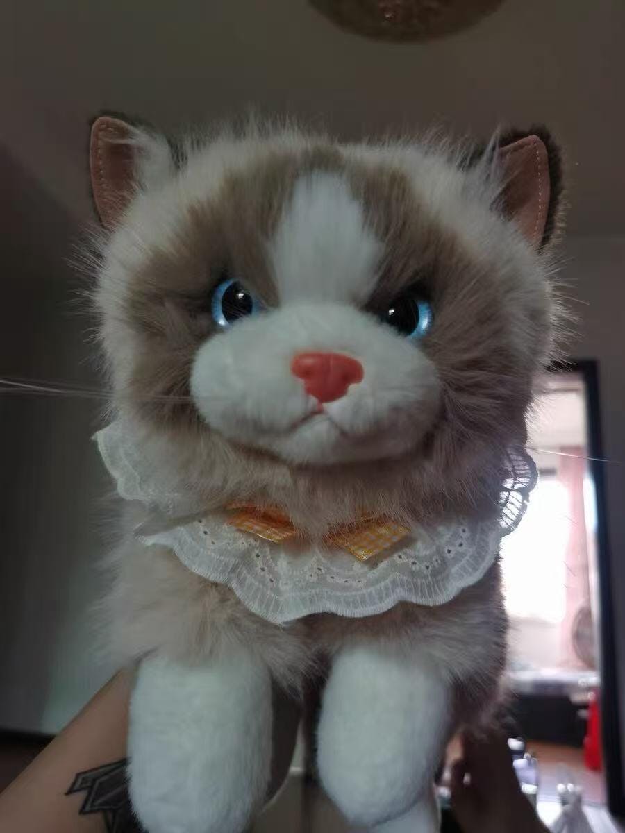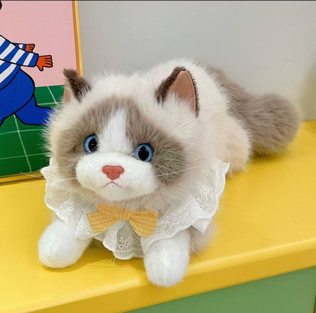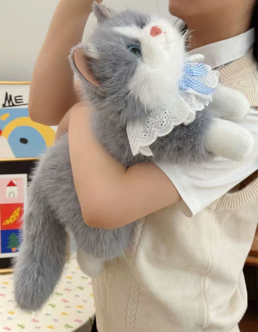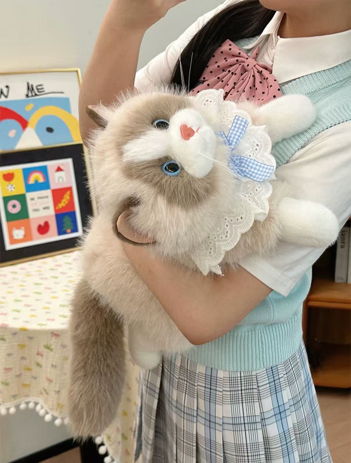 Inspired by the soft, cuddly charm of ragdoll cats, this lifelike kitty plush features full, fluffy fur and natural coloring. Bright blue eyes and a pink nose bring the face to life, while the fluffy tail pairs with a cute lace ruffle collar and gingham bow for an elegant, heart-warming look. Made with skin-friendly short-pile fabric and high-resilience filling, it’s velvety soft and satisfyingly plump to hug—perfect as a companion, a gift, home décor, or a photo prop.