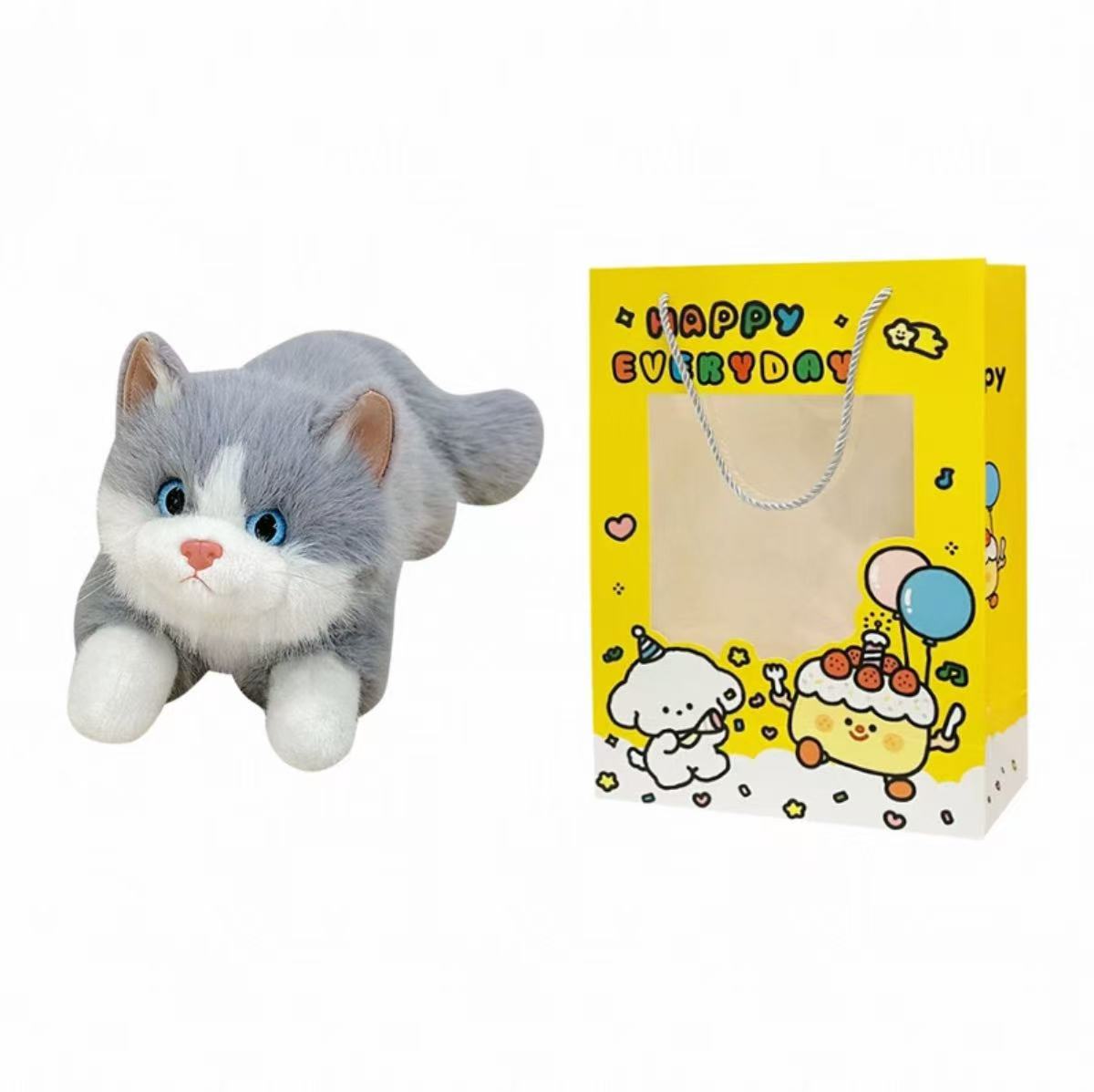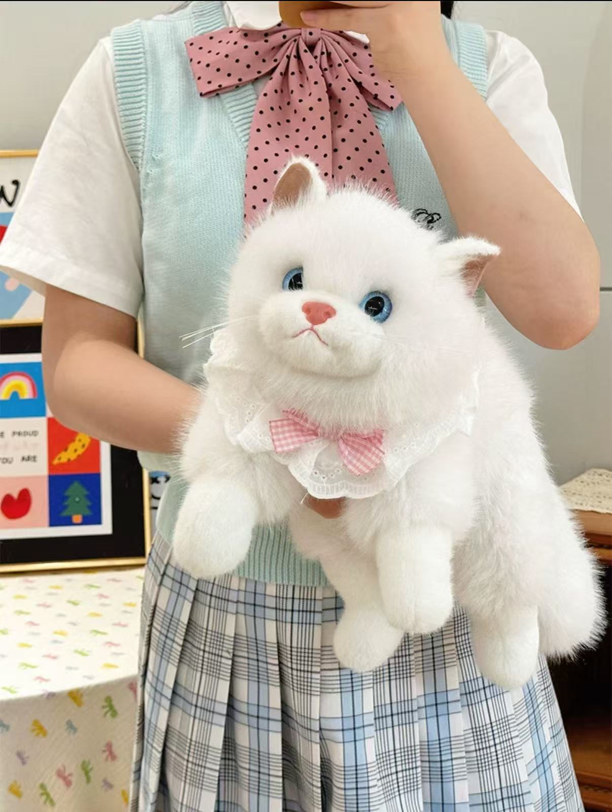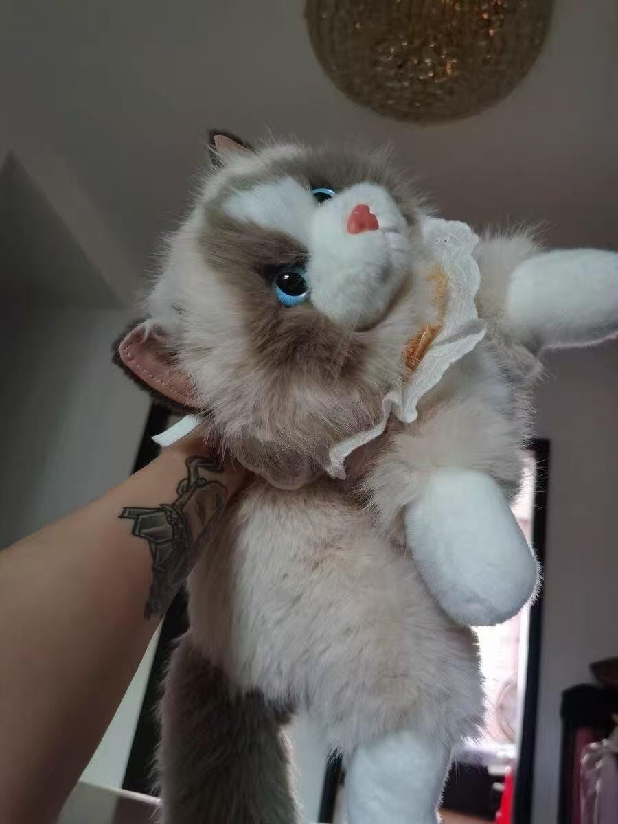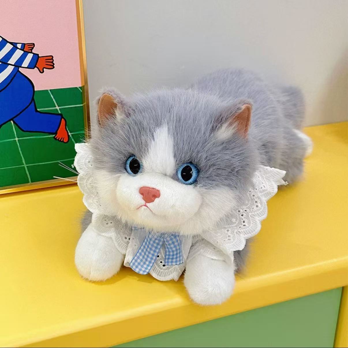 Inspired by the soft, cuddly charm of ragdoll cats, this lifelike kitty plush features full, fluffy fur and natural coloring. Bright blue eyes and a pink nose bring the face to life, while the fluffy tail pairs with a cute lace ruffle collar and gingham bow for an elegant, heart-warming look. Made with skin-friendly short-pile fabric and high-resilience filling, it’s velvety soft and satisfyingly plump to hug—perfect as a companion, a gift, home décor, or a photo prop.